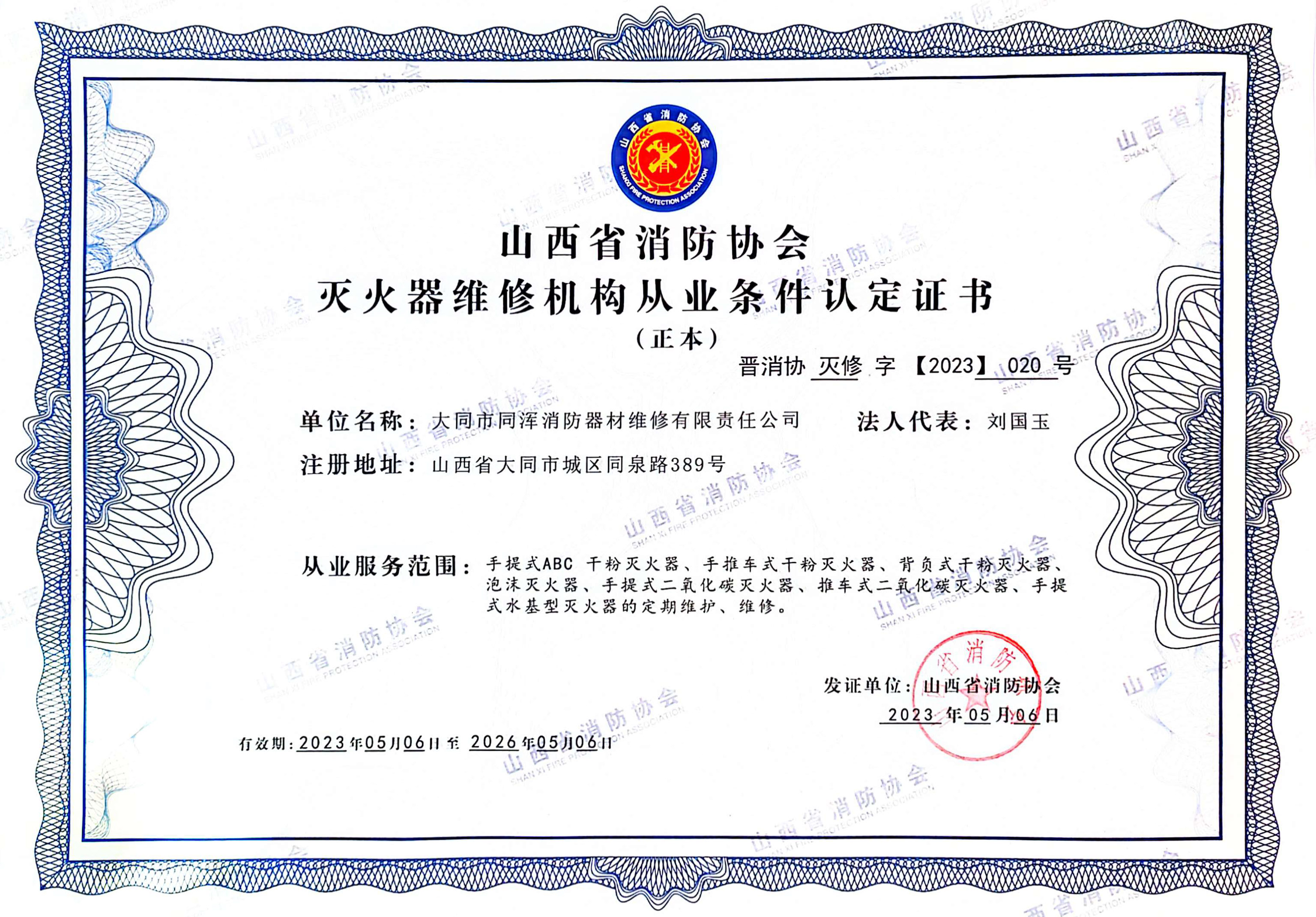 大同市同渾消防器材維修有限責任公司,位于大同市同泉路389號,始建于2000年,是公安部消防局定點銷售和維修的企業,歷經多年的創建、發展和拼搏,現有多家消防器材廠商供應我公司,并有現代化維修設備,標準的廠房,嚴格的管理,優良的設備,良好的服務并受到各行各業的好評。總經理劉國玉嚴格管理,嚴格要求,精益求精,認真負責,帶領團隊熱烈歡迎各界朋友顧客光臨。